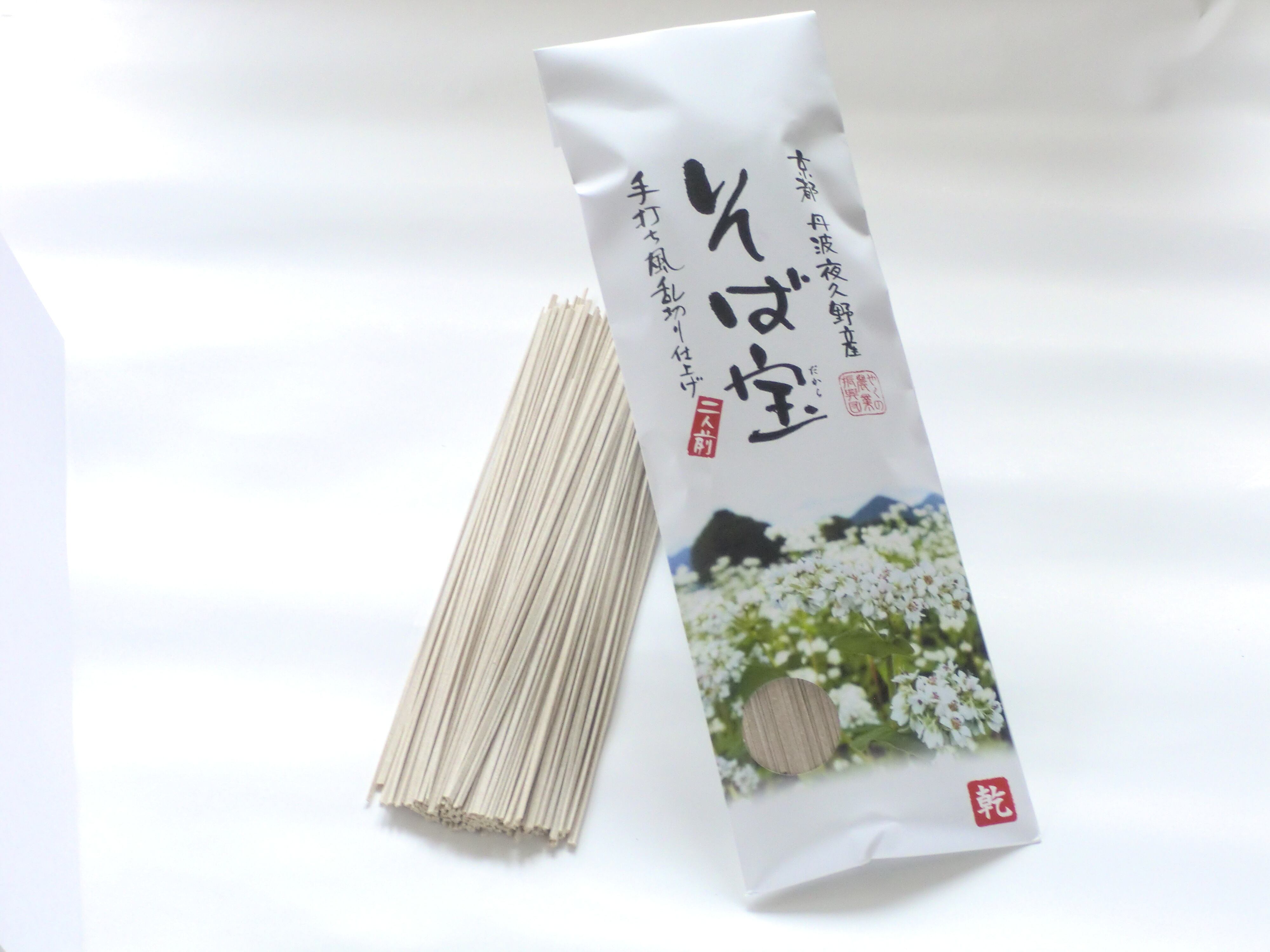 「そば宝」は<夜久野のそば>の復活をかけて近隣の農家と協力し、自社で生産したその良質なそばの実を外皮ごと挽いたそば粉『挽きぐるみ粉』をふんだん使用した、力強い味と香りの田舎蕎麦です。自社にて生産、製粉した農家こだわりの逸品をご賞味ください。